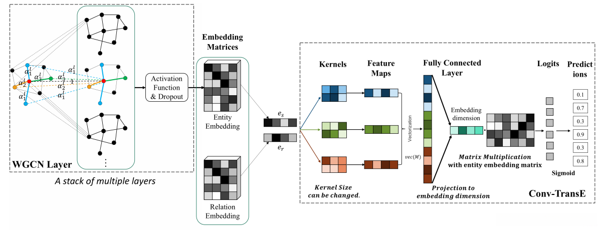 图结构感知卷积网络SACN : 由加权图卷积网络 (WGCN) 的编码器和 Conv-TransE 的卷积网络 的解码器组成。