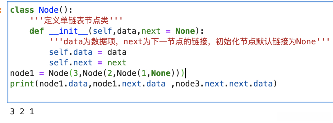 '''data为数据项,next为下一节点的链接,初始化节点默认链接为None'''