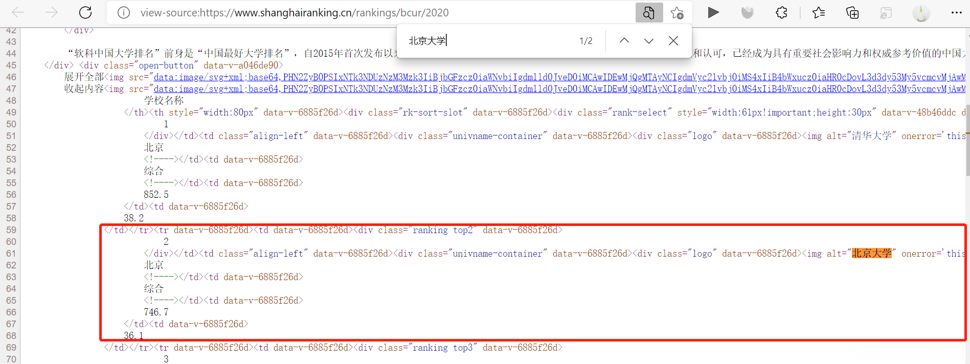 查看页面源代码,Ctrl+F搜索北京大学,可以定位到与大学排名相关的代码位置,观察代码可知,所有的大学排名信息被封装在