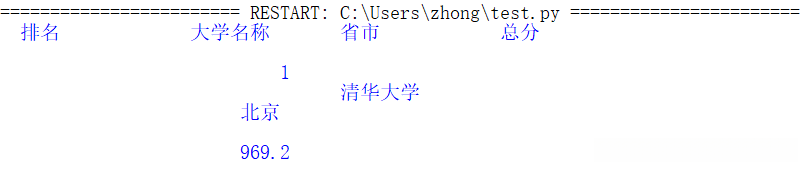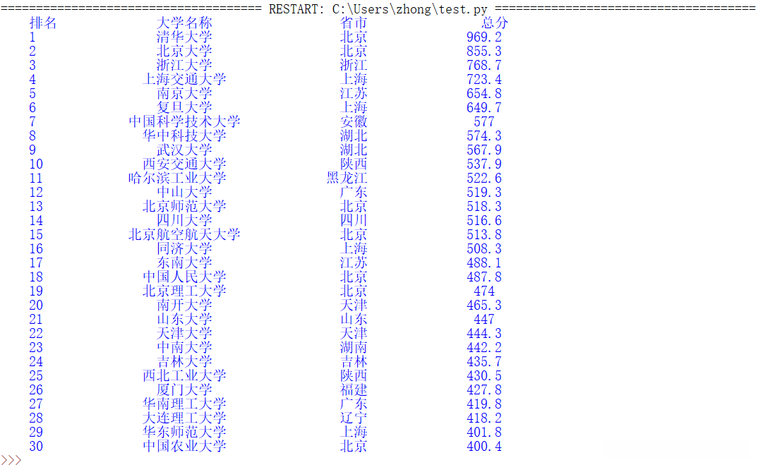 爬取目标:爬取上海软科官网提供的中国最好大学排名,并在IDLE页面打印输出大学名称、排名、省市、总分信息