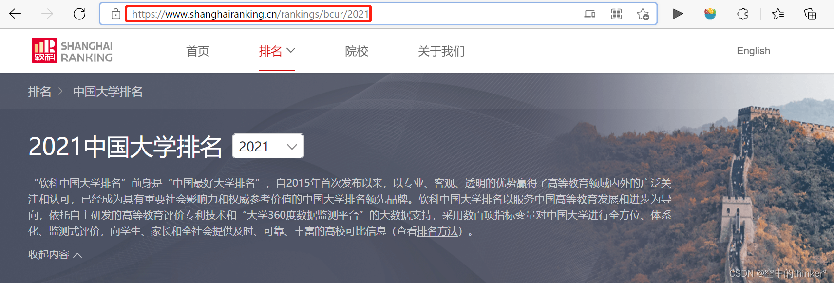 目标网页:https://www.shanghairanking.cn/rankings/bcur/2021