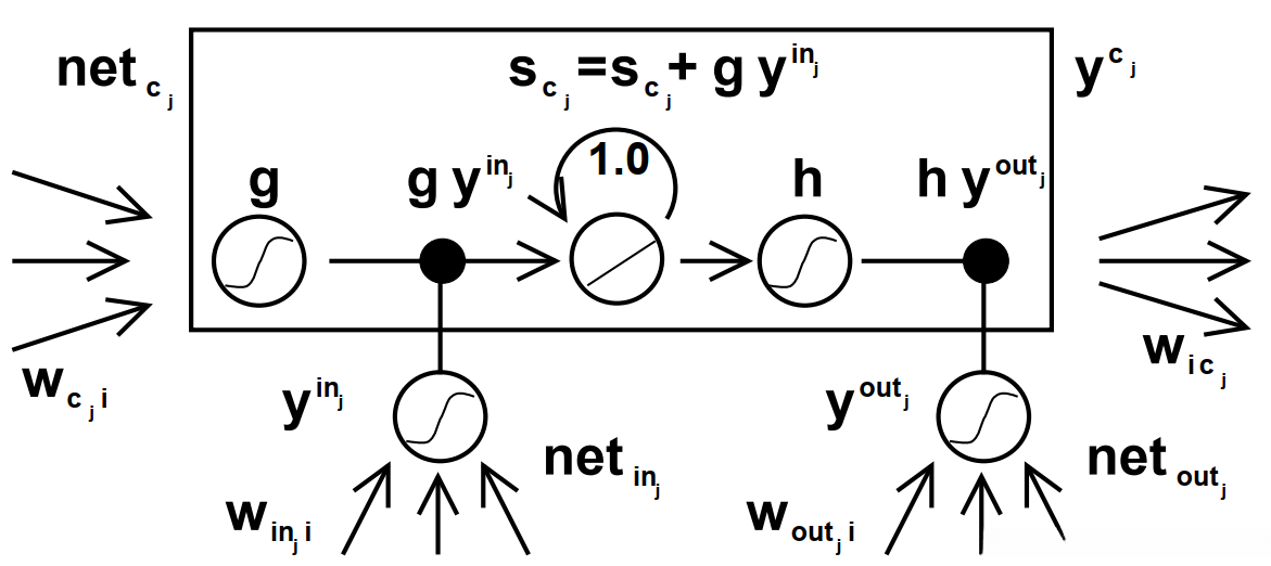 为了解决输入和输出权重冲突,作者采用了CEC,并引入输入门和输出门去解决输入权重冲突和输出权重冲突问题。输入门单元的作用是保护存储在神经元j中的内容不受不相关输入的干扰(解决输入权重冲突)。同样的,输出门单元的作用是保护其他的神经元不受当前存储在神经元j中不相关的内容的干扰(解决输出权重冲突)。 于是就形成了一个比传统RNN更为复杂的单元:记忆细胞。
