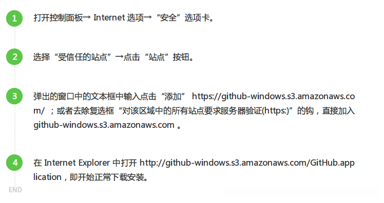 在第一个方案未能在我电脑上成功实施后(...),之后便不再进行尝试(...)。具体而言,在Windows 8.1版本通常配备的是IE11浏览器(这个我通过测试发现https://github-windows.s3.amazonaws.com/GitHub.application是可以正常访问的),但这一切都因网络问题而难以解决(一切的努力都无济于事)。通过调整hosts配置也难以取得明显的效果(这种做法同样面临网络障碍的限制)。