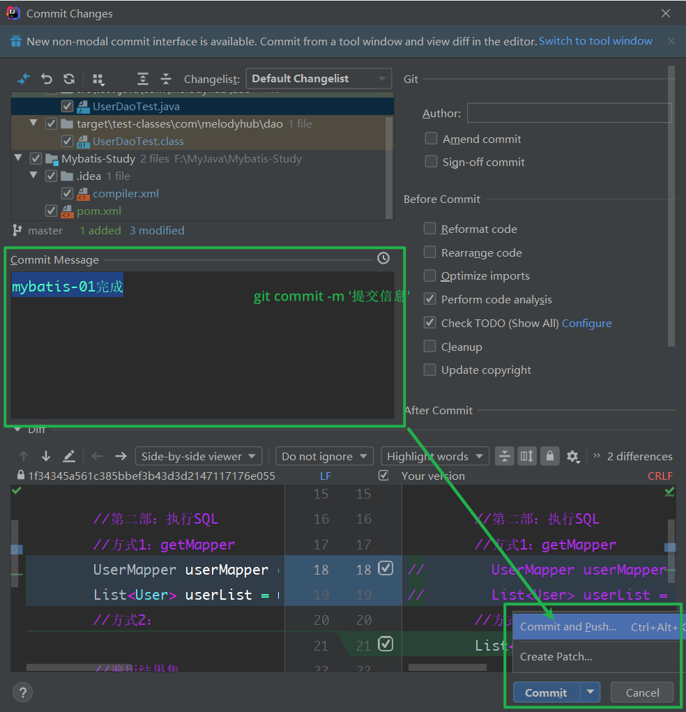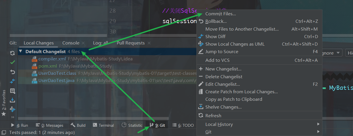 添加提交信息,下方Git 选项卡,右键Default Changelist -- >Commit Files… -->Commit Message --> Commit(或Commit and Push…)
