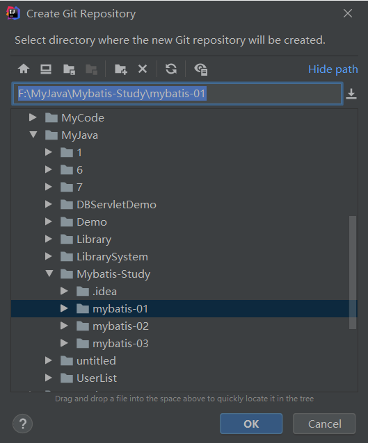 在弹出对话框中,选择所在项目的位置,即创建本地仓库 ,点击OK