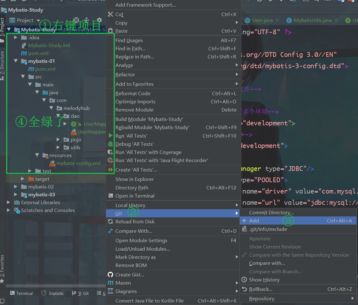 - 上传项目到本地仓库, 项目右键选择Git– >add