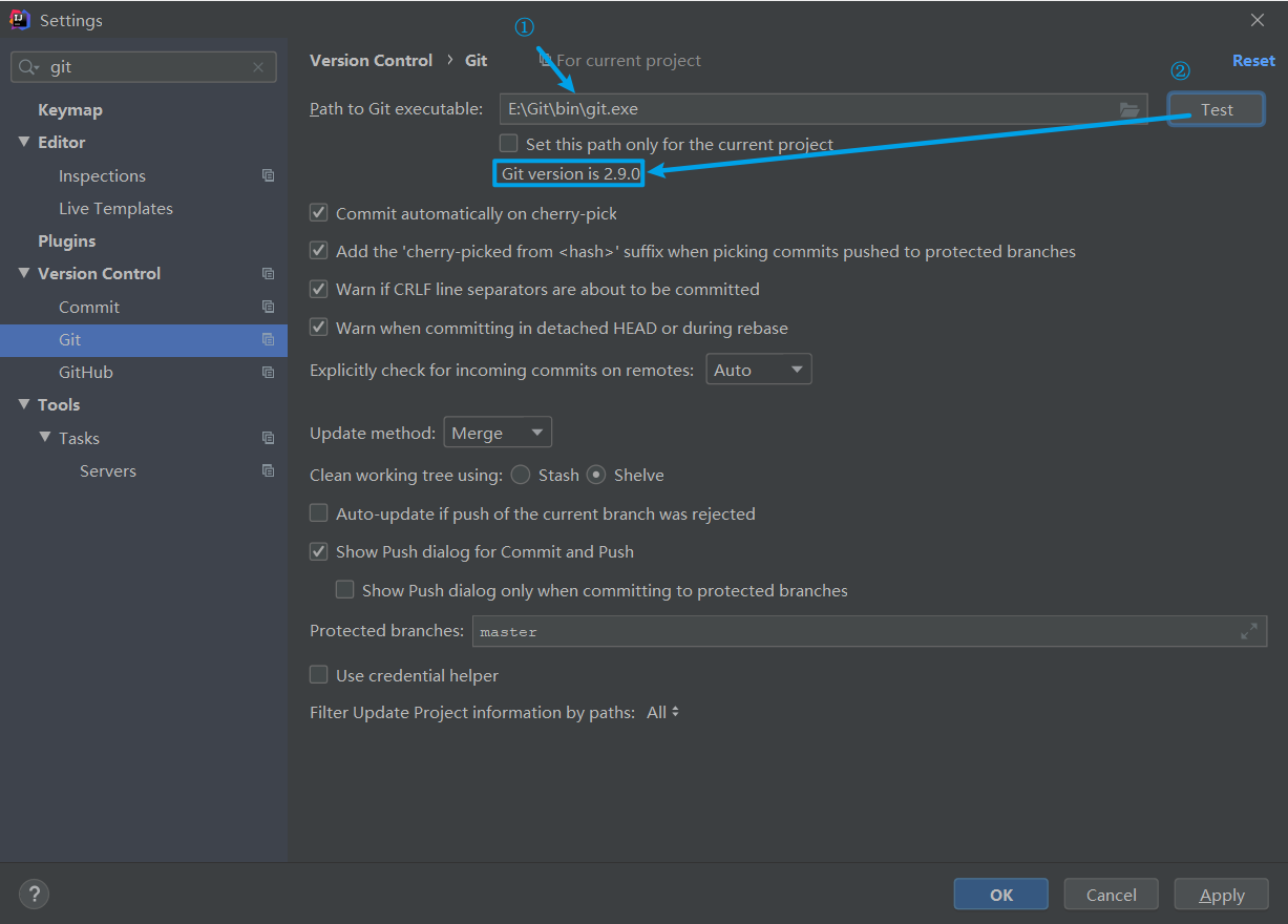 在IDEA中设置Git,在File– >Setting->Version Control–>Git–>Path to Git executable选择你的git安装后的git.exe 文件,然后点击Test ,测试是否设置成功