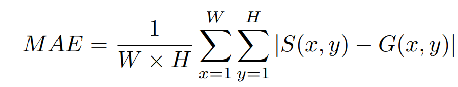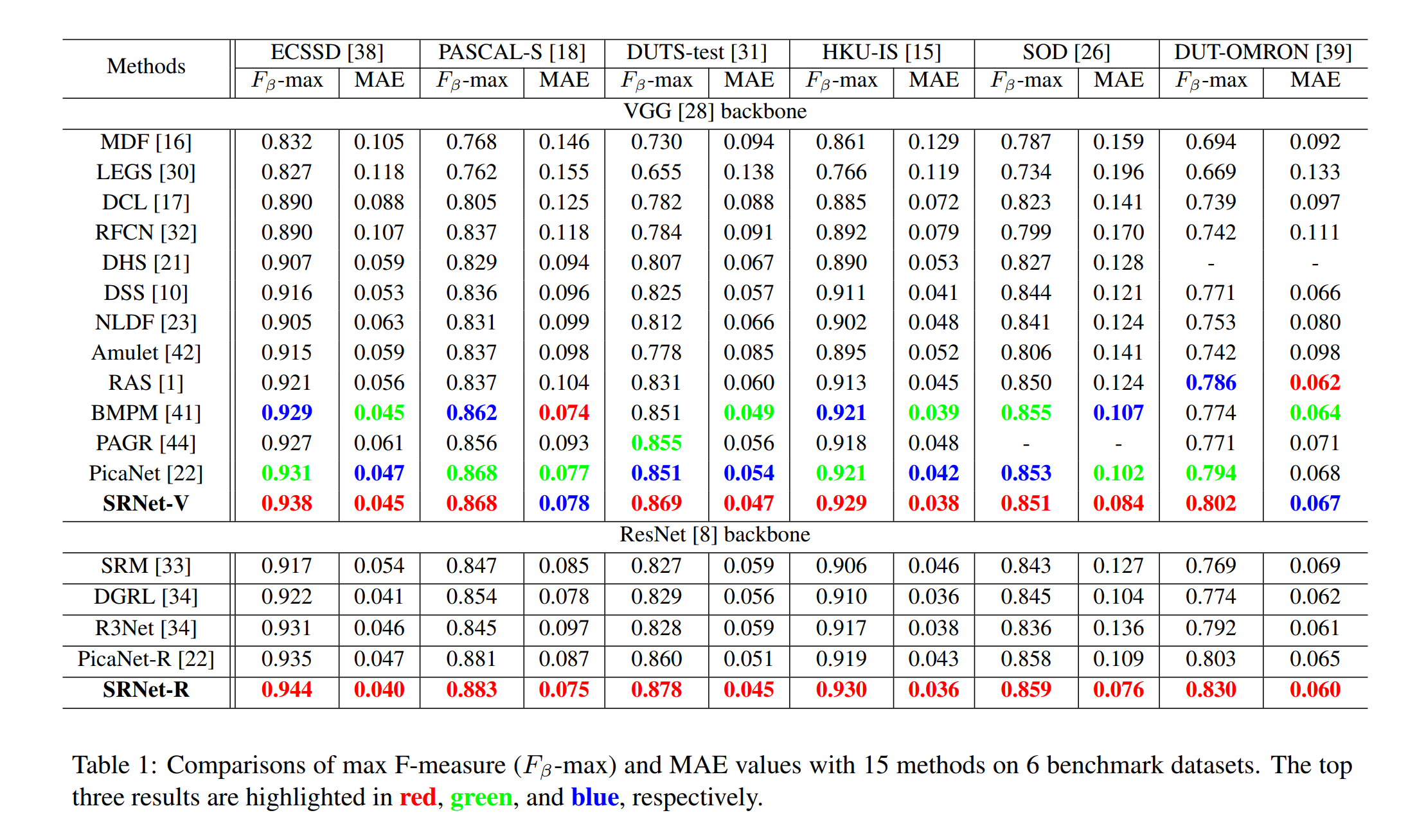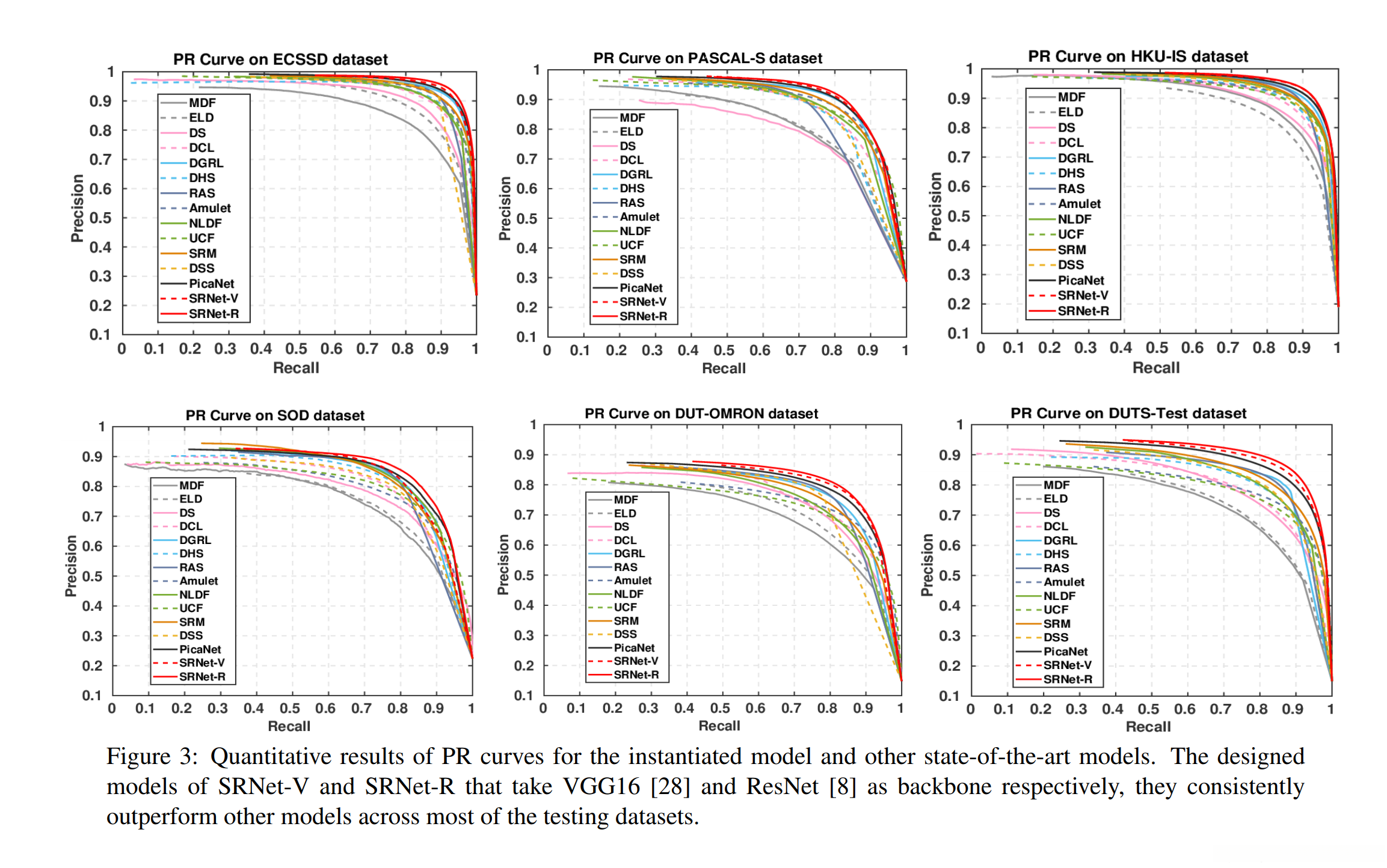 我们使用广泛采用的精准召回曲线(precision-recall (PR) curves),max F-measure (Fβ-max)以及平均绝对误差(mean absolute error (MAE))