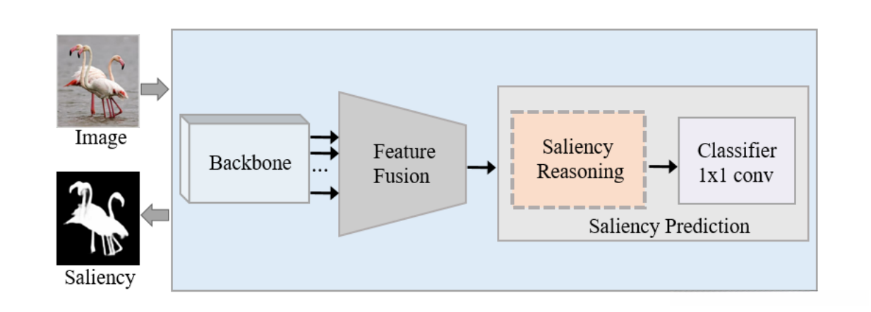 基于FCN的显著性检测通常包含三个部分:主干网络(BackBone),特征融合,显著性推断。如上图所示,主干网络通常会产生一组空间分辨率更低的特征;特征融合旨在强化获取的多级特征,以获得具有独特性的对象信息和局部细节信息;检测器通过两个步骤预测显著性:一个是显著性推断(Saliency Reasoning),使用少量的卷积层 来提升多层级特征,另一个是一个1x1的卷积层,来区分显著性检测中的背景与前景。