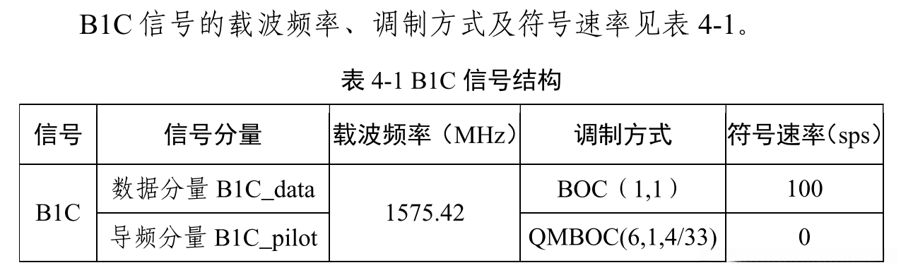 B1C 信号只在北斗三号中圆地球轨道 (MEO)卫星和倾斜地球同步轨道(IGSO)卫星上播发,提供公开 服务,地球静止轨道(GEO)卫星不播发 B1C信号。B1C是针对以载波频率 1575.42 MHz 为中心的 32.736 MHz 带宽内的信号。采用功率归一化的复包络形式来描述信号调制方式。卫星发射信号为右旋圆极化(RHCP)。