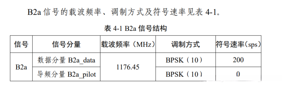 B2a 信号只在北斗三号中圆地球轨道 (MEO)卫星和倾斜地球同步轨道(IGSO)卫星上播发,提供公开 服务,地球静止轨道(GEO)卫星不播发 B2a 信号。B2a是以载波频率 1176.45 MHz 为中心 的 20.46 MHz 带宽内的 信号。采用功率归一化的复包络形式来描述信号调制方式。卫星发射信号为右旋圆极化(RHCP)。