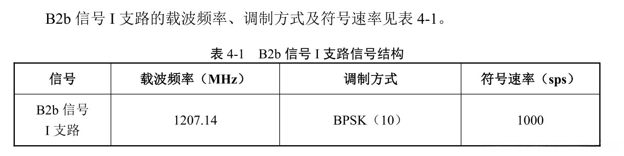北斗三号中圆地球轨道(MEO)卫星和倾斜地球同步轨道(IGSO) 卫星 使用B2b 信号基本导航服务。是针对以载波频率 1207.14MHz 为中心的 20.46MHz 带宽内的 B2b 信号 I 支路。卫星发射信号为右旋圆极化(RHCP)。