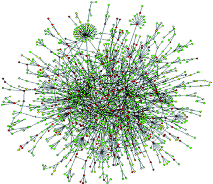 基于计算的方法预测蛋白质复合物可以有效弥补生物实验的不足,短时间内可在大型生物网络上预测出许多高置信度的蛋白质复合物。在现有的计算方法中,通常用无向网络来表示蛋白质之间相互作用关系,记为 G=(V,E)。其中, G表示蛋白质相互作用网络, V代表蛋白质集合, E代表蛋白质之间相互作用集合。 图 2 所示为酵母菌蛋白质相互作用网络。基于计算的方法预测蛋白质复合物,主要是利用网络所包含的拓扑结构和节点所包含的生物属性为特征,采用聚类方法在PPI网络上挖掘密集子图,将得到的密集子图作为最终的蛋白质复合物。结果表明,基于计算的方法对于分析PPI网络、预测蛋白质复合物等效果显著。