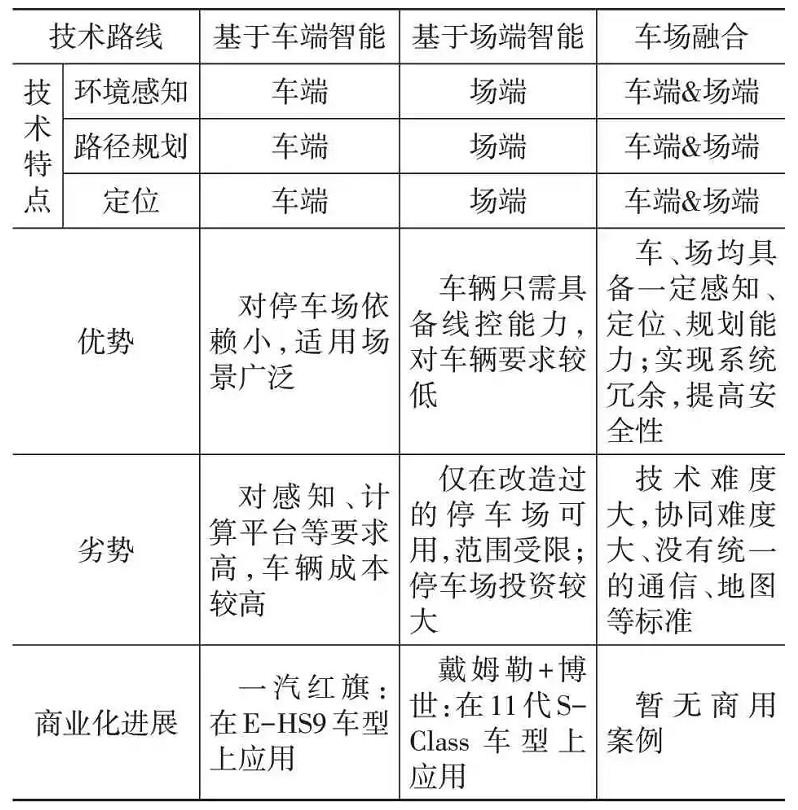 基于场端智能技术路线优势在于车辆只需具备线控能力,对车辆要求较低;劣势在于仅在改造过的停车场可用,范围受限;停车场投资较大,投资回报周期长;戴姆勒和博世集团公司是该技术路线的实践者,目前在S-Class车型上量产应用。