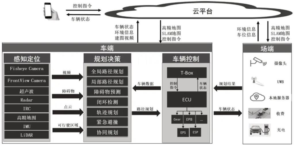 AVP系统的总体方案如图2所示,主要由车端、场端、云端和手机端4部分构成。图2去掉右侧的场端部分,就是基于车端智能的技术方案,在车辆上搭载环视、前视、后视、Radar、LiDAR、USS传感器及高算力计算平台;图2去掉车端的环境感知和规划决策模块,就是基于场端智能的技术方案,在场端布置摄像头、激光雷达、UWB、边缘服务器设备,实现障碍物探测、高精度定位和规划决策的智能化功能。车端、场端、云端及手机端4部分联合,就构成了完整的车场协同控制的代客泊车系统,车场协同控制因融合和车端和场端功能的优势,可以联合自动地锁、自动充电、无线充电、自动洗车的基础服务,实现更加智能、安全、丰富的闭环生态场景,因此,车场协同控制是未来自动代客泊车技术的发展方向。