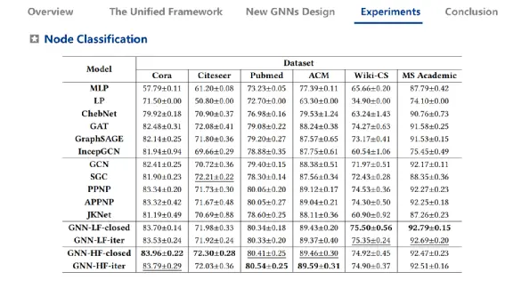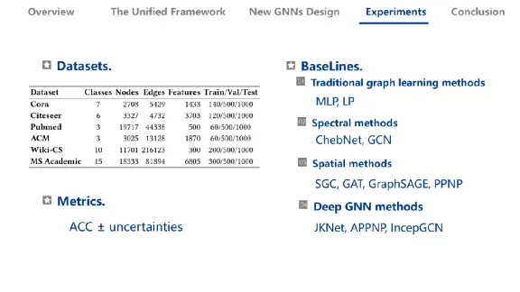实验部分主要对6个数据集上的4大类经典模型进行了比较分析,具体包括经典的图学习模型、基于频谱域和空域的模型,以及浅层和深层的图神经网络模型。同时,我们在这些数据集上引入了一个评价指标来进行评估。