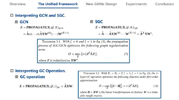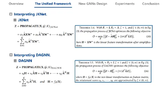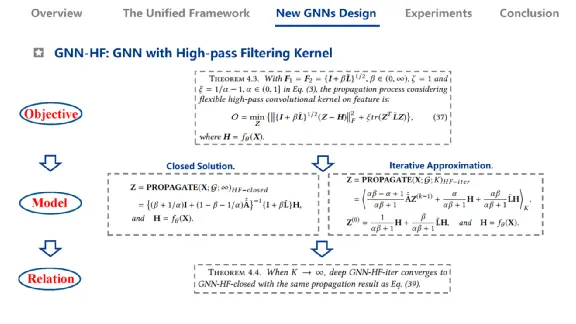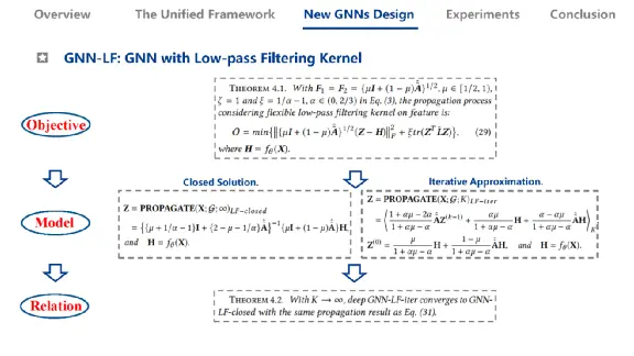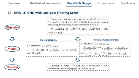 换句话说,同一个优化目标,可以通过求解得出一个闭式解和一个迭代解,这两个解具有等价性。通过这两个解,我们可以分别设计新的图神经网络结构,从而形成了两种不同的图神经网络变体。这就是我们整个设计过程的核心逻辑。