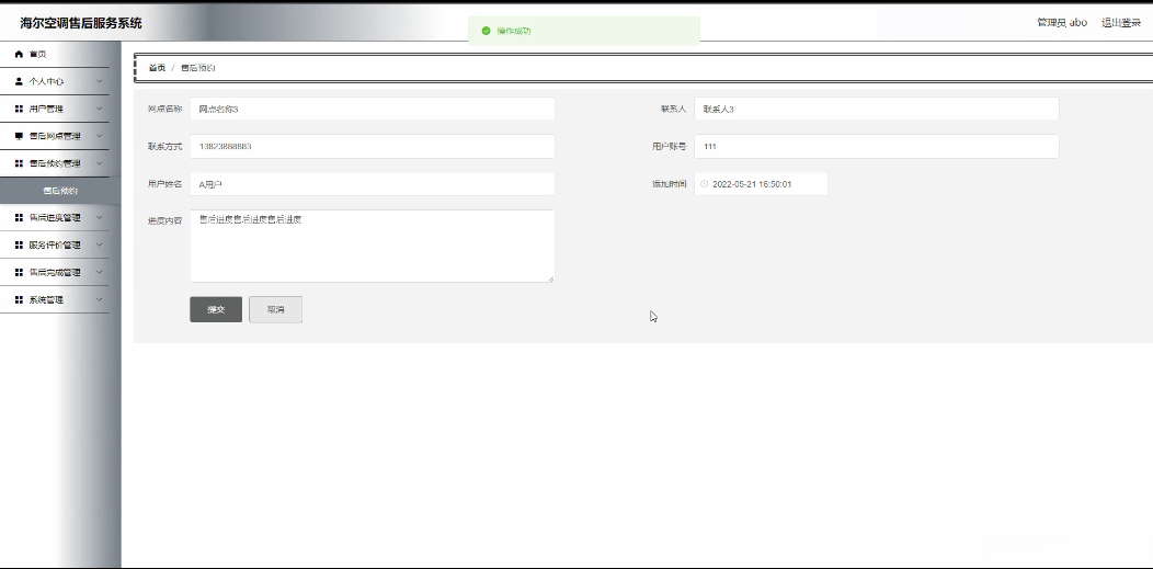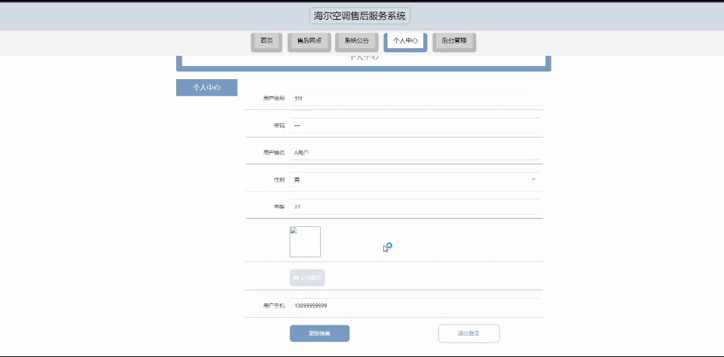 用户管理 :提供用户注册、登录、个人信息管理等功能,确保用户身份的真实性和信息安全。用户可以通过系统查看自己的售后服务记录,包括预约信息、维修进度、服务评价等。