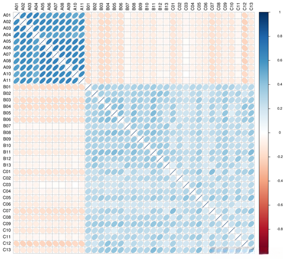 注:图中不同颜色代表****spearman 相关系数的高低; 相关系数与颜色间的关系见右侧图例说明; 颜色越深代表样品间相关系数的绝对值越大; 椭圆向左偏表明相关系数为正,右偏为负; 椭圆越扁说明相关系数的绝对值越大。
