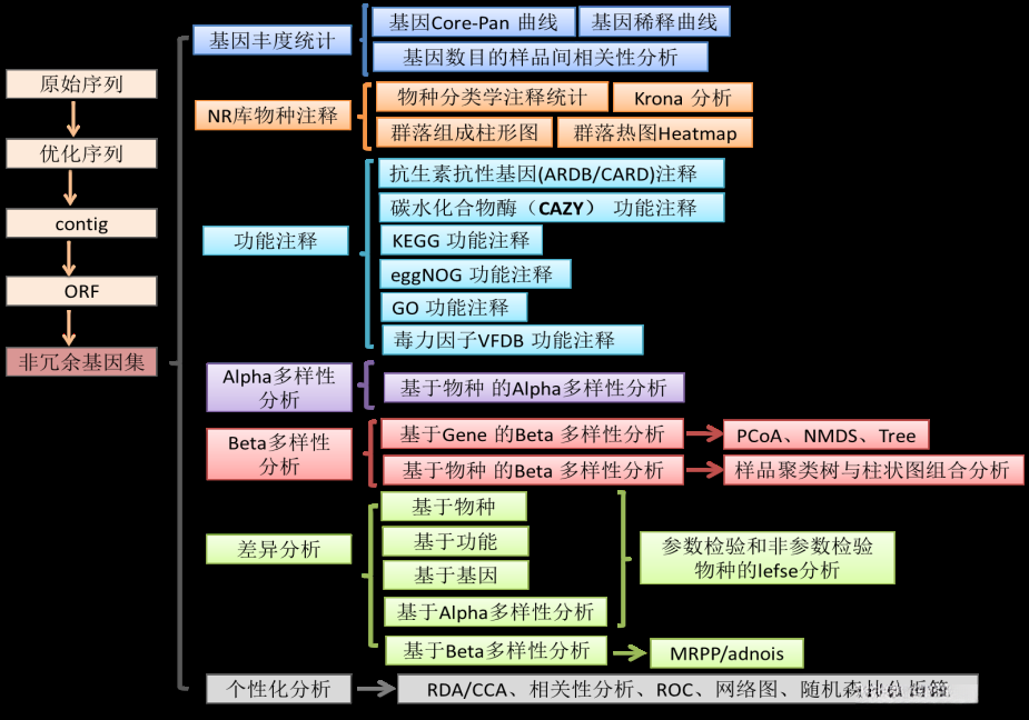 数据分析从下机原始序列开始,首先对原始序列进行去接头、 质量剪切以及去除污染等优化处理。然后使用优质序列进行拼接组装和基因预测,将各样本预测得到的基因集合并在一起去冗余,得到非冗余基因集;对得到的非冗余基因集进行物种和功能上的注释,并使用BWA软件将优化序列比对到非冗余基因集,计算得到各基因在各样品中的丰度信息(RPKM); 对物种和功能注释结果进行统计分析。