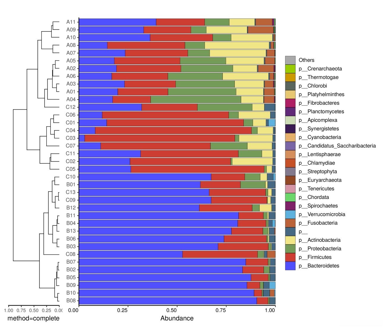 左边是样品间基于群落组成的层次聚类分析(Bray-curtis 算法),右边是样品的群落结构柱状图。
