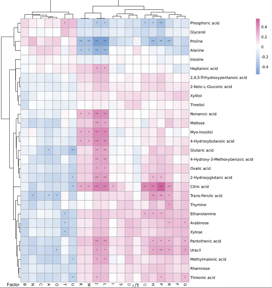 (2)横轴代表的是临床因子,纵轴代表的是代谢物。