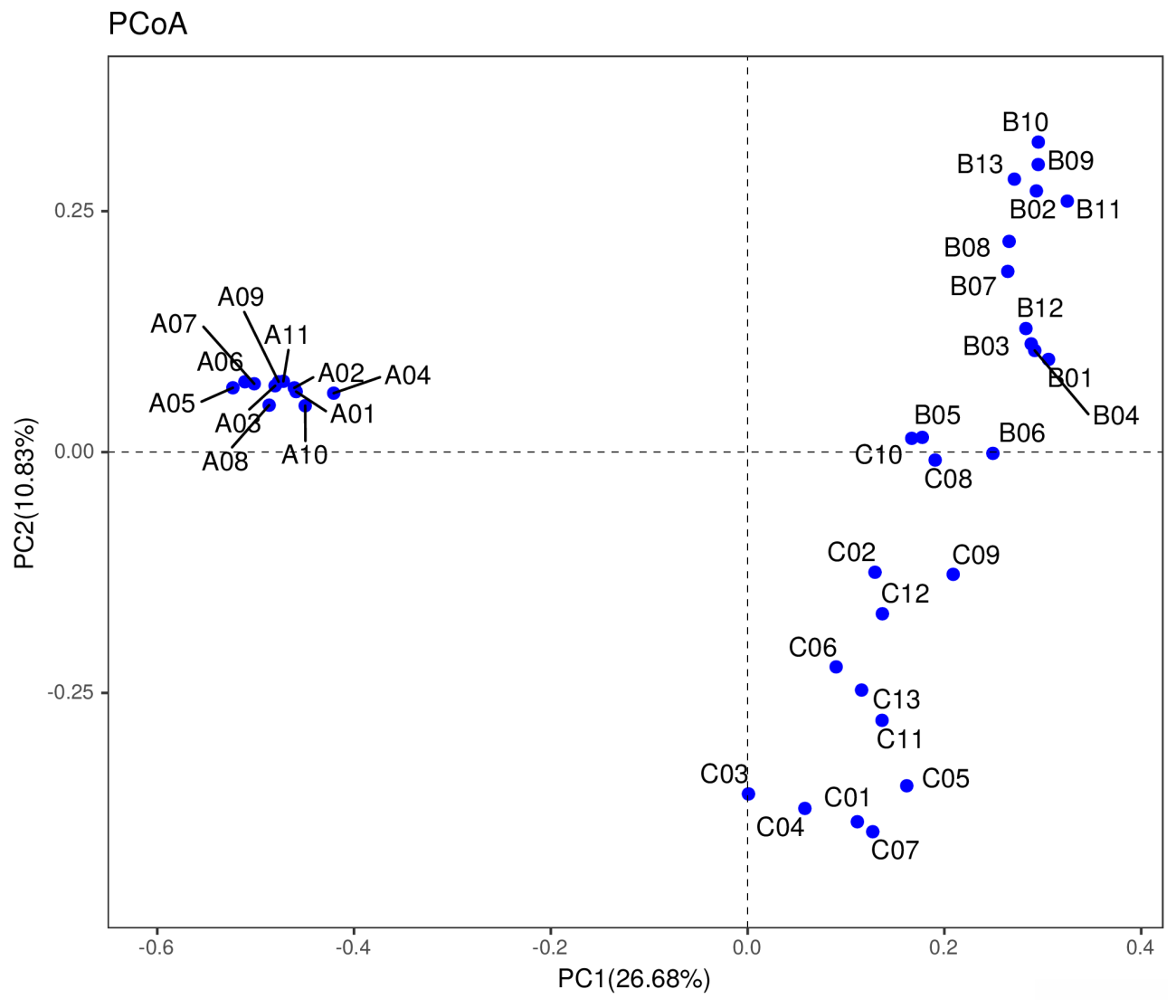Beta多样性(Beta diversity)分析是用来比较一对样品在物种多样性方面存在的差异大小。分析各类群在样品中的含量,进而计算出不同样品间的Beta多样性值。多种指数可以衡量Beta多样性,常用的为Bray-Curtis,Jaccard。我们将以这两种方法得到的矩阵,做NMDS,PCoA及聚类树分析。