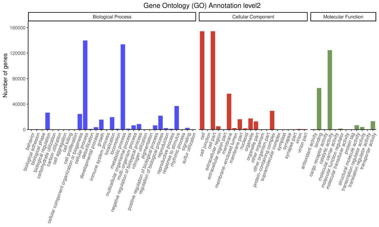 注: 横坐标表示 Level2 水平上 GO term,不同颜色代表不同 GO 类,分为三大类,纵坐标表示 注释到该 term 上面的 Unigene 数目