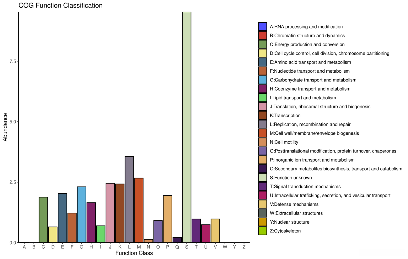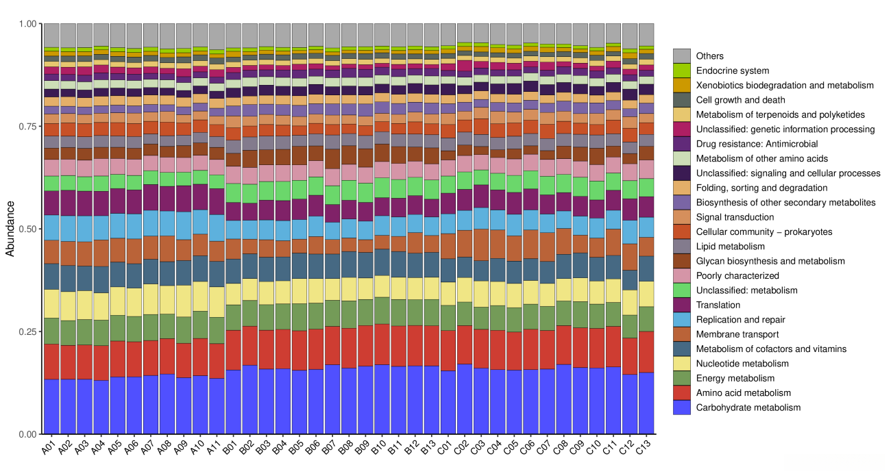注: 横坐标6大功能类,纵坐标基因丰度,颜色表示功能。