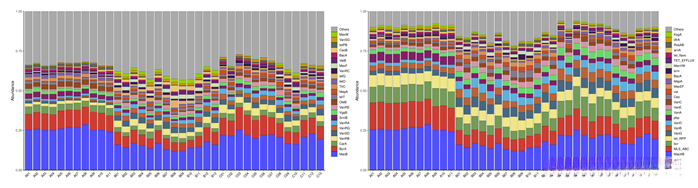 注: 横坐标每个样本,纵坐标基因丰度,颜色表示名称。