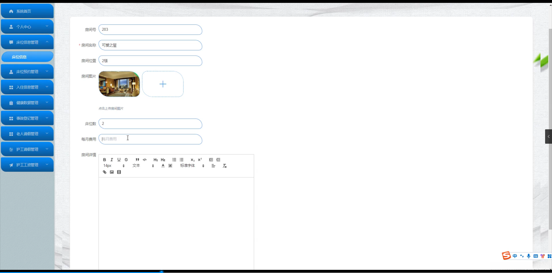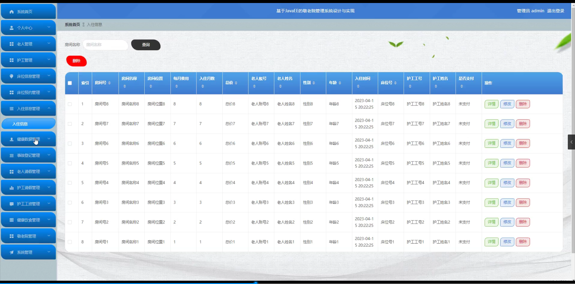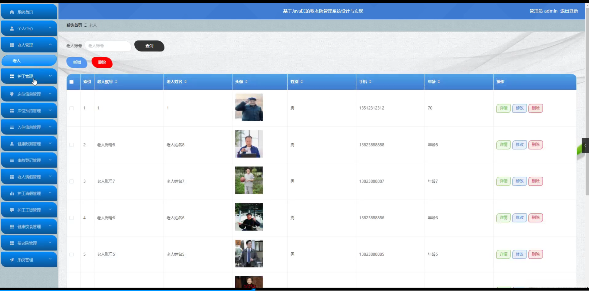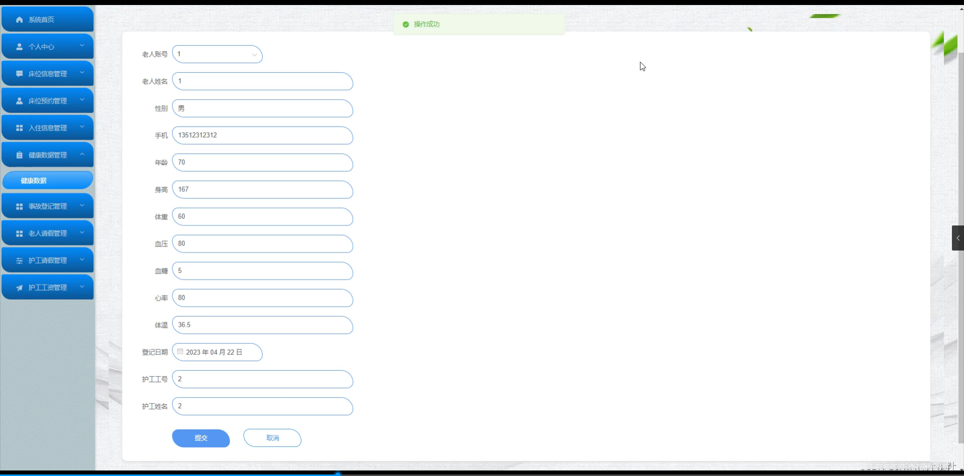 随着社会的快速发展和人口老龄化的加剧,老年人口数量逐年增加,养老问题日益凸显。传统的敬老院管理方式已经无法满足现代社会的需求,因此,开发一套高效、便捷、智能的敬老院管理系统显得尤为重要。该系统将利用现代信息技术手段,实现对敬老院各项业务的信息化管理,提高敬老院的管理水平和服务质量。本课题将采用前端技术HTML、CSS、JavaScript和Vue框架,结合后端Python和Flask框架,以及MySQL数据库,开发一套完整的敬老院管理系统。通过该系统,可以实现对敬老院的老人信息、员工信息、房间信息、费用信息等进行有效管理,提高工作效率,降低运营成本,为老年人提供更加优质的养老服务。
