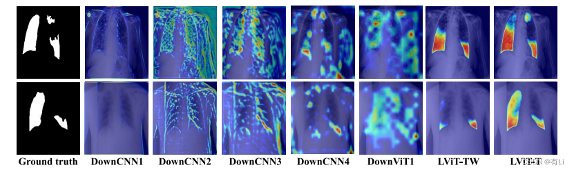图6. 在QaTa-COV19数据集上对LViT不同层级进行可解释性研究的显著性图。第一行的语言输入是“双侧肺感染,三个感染区域,全部左肺和上下右肺”。第二行的语言输入是“双侧肺感染,两个感染区域,全部左肺和下右肺”。