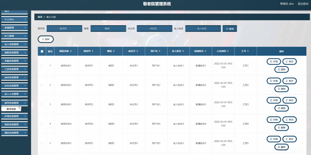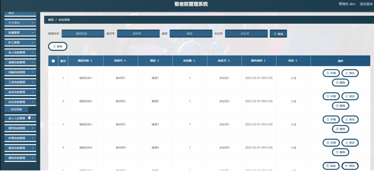 老人入住管理,在老人入住管理页面可以对索引,楼层名称,房间号,楼层,床位号,用户名,老人姓名,家属姓名,入住时间,工号等内容进行详情,修改,删除操作,如图5-9所示。
