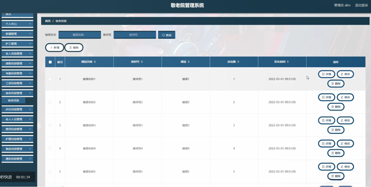 宿舍信息管理,在宿舍信息管理页面可以对索引,楼层名称,房间号,楼层,床位数,发布时间等信息进行详情,修改,删除操作,如图5-6所示。