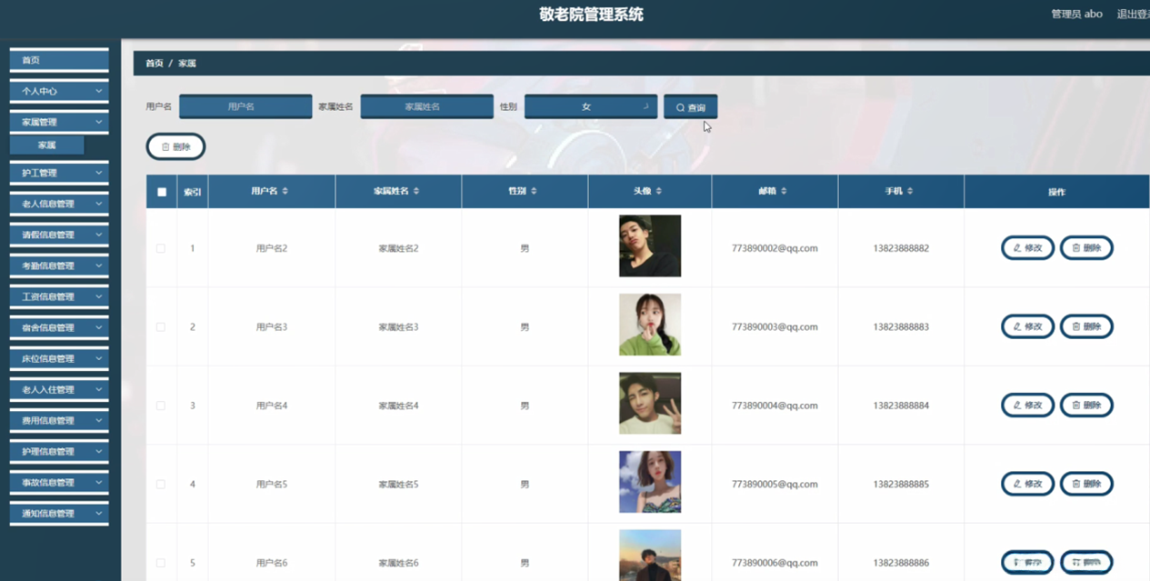 家属管理,在家属管理页面可以对索引,用户名,家属姓名,性别,头像,邮箱,手机等内容进行详情,修改,删除操作,如图5-4所示。