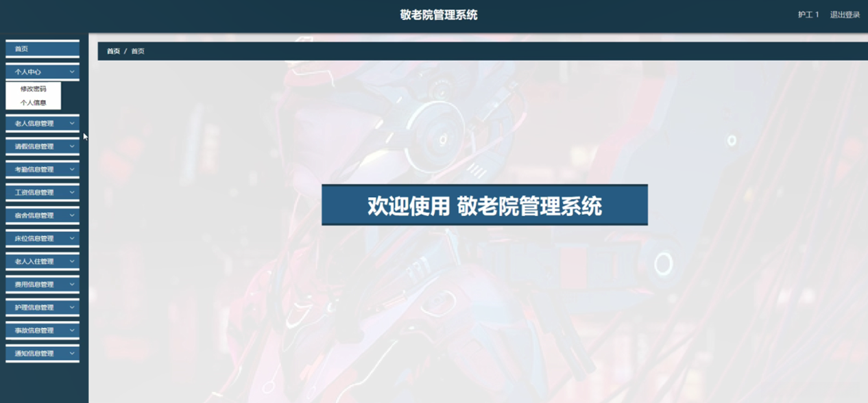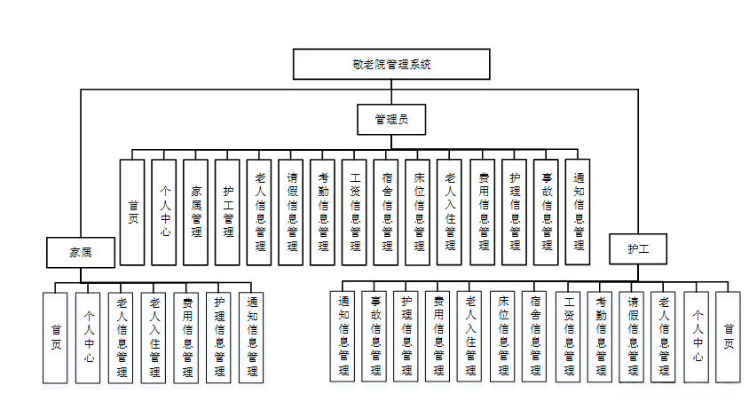 系统由管理员,家属,护工三个角色组成,主要功能包括首页,个人中心,家属管理,护工管理,老人信息管理,请假信息管理,考勤信息管理,工资信息管理,宿舍信息管理,床位信息管理,老人入住管理,费用信息管理,护理信息管理,事故信息管理,通知信息管理等;