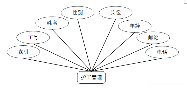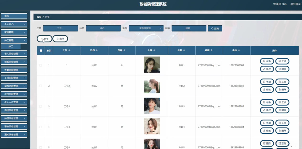 护工管理,在护工管理页面可以对索引,工号,姓名,性别,头像,年龄,邮箱,电话等信息进行详情,修改,删除操作,如图5-5所示。
