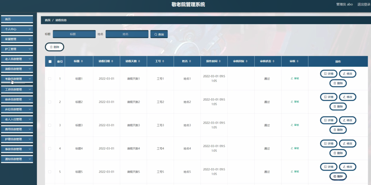 请假信息管理,在请假信息管理页面可以对索引,标题,请假日期,请假天数,工号,姓名,操作时间,审核回复,审核状态,审核等内容进行详情,修改,删除操作,如图5-7所示。