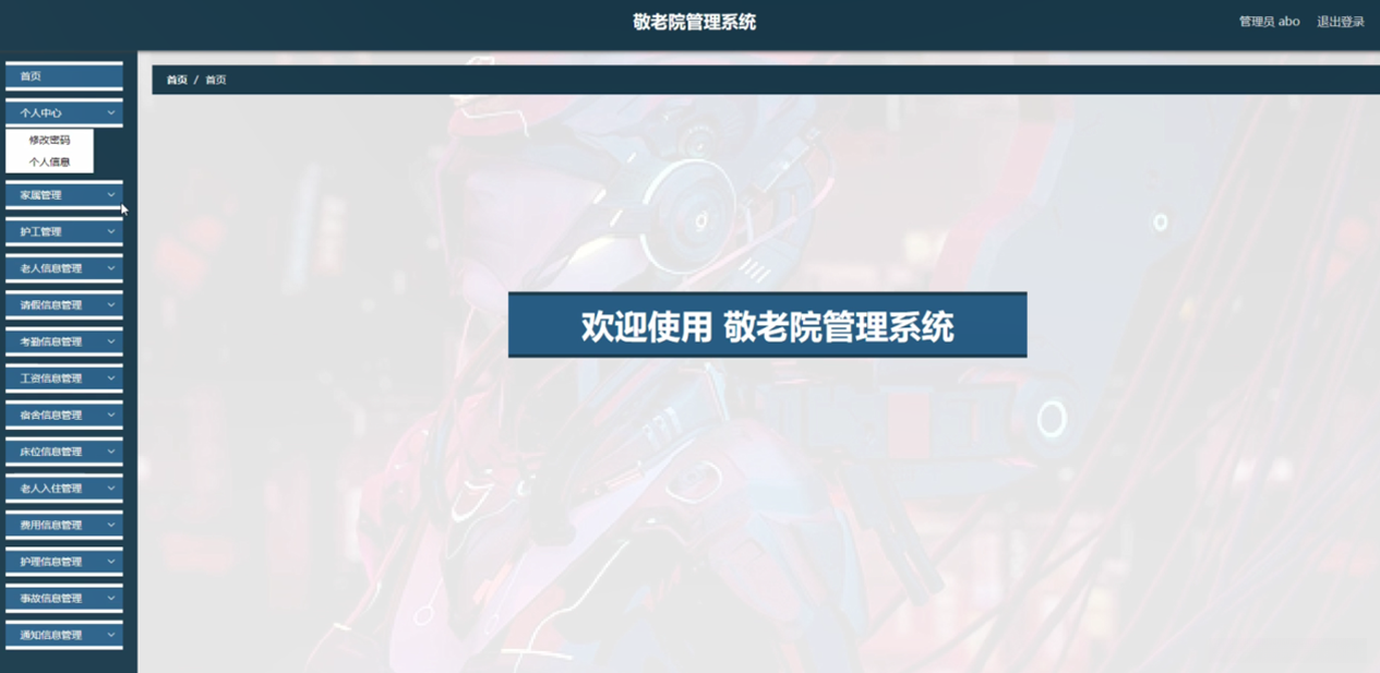管理员登录系统后,可以对首页,个人中心,家属管理,护工管理,老人信息管理,请假信息管理,考勤信息管理,工资信息管理,宿舍信息管理,床位信息管理,老人入住管理,费用信息管理,护理信息管理,事故信息管理,通知信息管理等功能进行相应的操作管理,如图5-3所示。