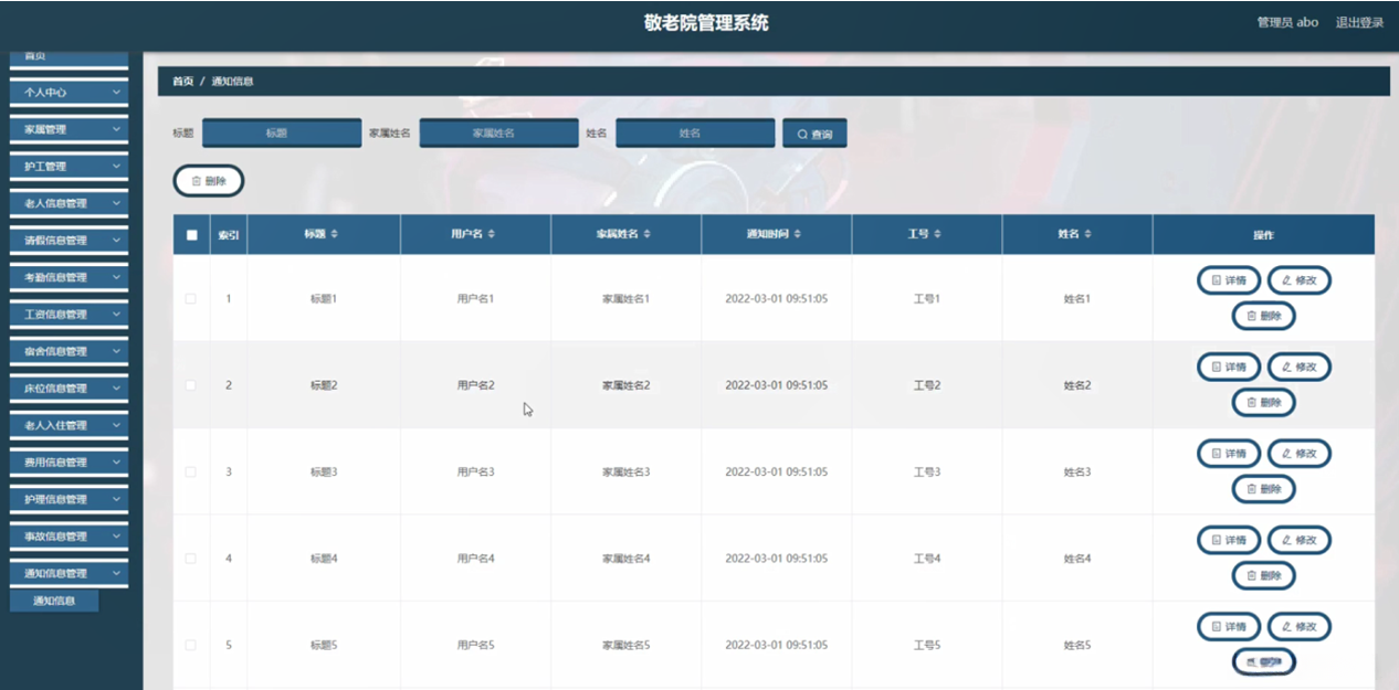 通知信息管理,在通知信息管理页面可以对索引,标题,用户名,家属姓名,通知时间,工号,姓名等内容进行详情,修改,删除等操作,如图5-10所示。