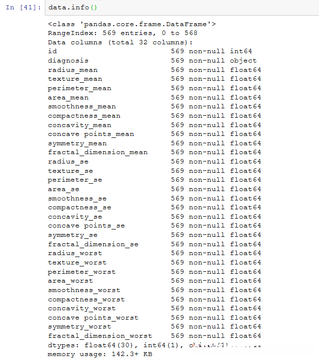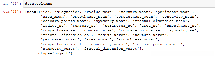 mean用于表示平均值计算结果,se用于表示标准差计算结果,worst用于表示最大值计算结果;最后30个特征量实际上是基于前10个形态学特异性参数(即radius, texture, perimeter, area, smoothness, compactness, concavity, concave points, symmetry以及fractal_dimension)的均值及其方差和最大统计量进行计算得到的结果
