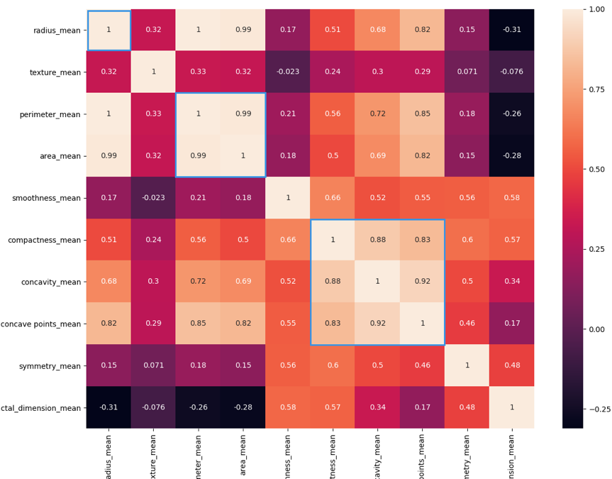radius\_mean、perimeter\_mean 和 area\_mean 之间具有高度相关性,并与 compactness\_mean、concavity\_mean 和 concave\_points\_mean 的相关性较低。