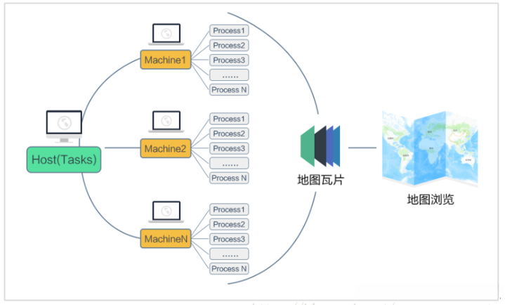 多任务切图是将地图切图任务拆分成多个子任务,同时开启多个进程,每个进程自动领取并执行切图子任务。切图结果支持保存为本地瓦片,也支持保存到MongoDB数据库。多任务切图支持在一台计算机上开启多个进程执行切图任务,也支持在多个计算机分别开启多个进程,获取子任务执行切图任务。