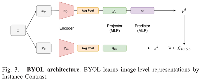 如图 3 所示,对于给定未标记数据集中的每个图像 x,BYOL 首先通过随机数据增强生成 x 的两个视图 x q、x k。两个视图 x q, x k 分别通过 在线编码器 eo 和动量编码器 em ,然后通过全局平均池化 和投影器 go, gm ,用嵌入向量 zq, zk 对每个视图进行编码。