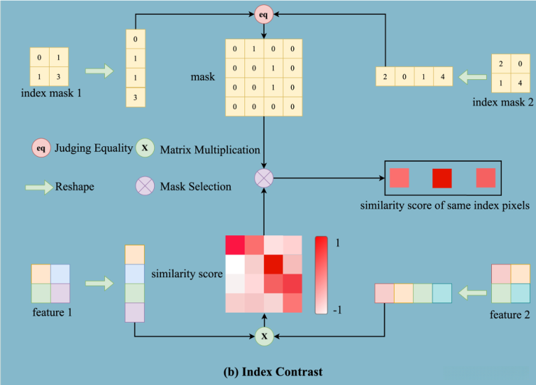 对于特征图 p∗, z∗ ∈ RH ×W×C,其中 H 和 W 表示特征图的空间大小 (7 × 7),C 是通道数,我们首先 在通道维度 将它们 l2范数归一化,并计算 p∗ 和 z∗ 的像素之间的余弦相似度 。然后,我们一一检查M1、M2中像素之间的索引值是否相同,生成二值掩码 。最后,根据这个二值掩码,我们得到 S ∈ RN,它是对应像素的相似度得分,N 是对应像素对的数量[见图 4(b)]。