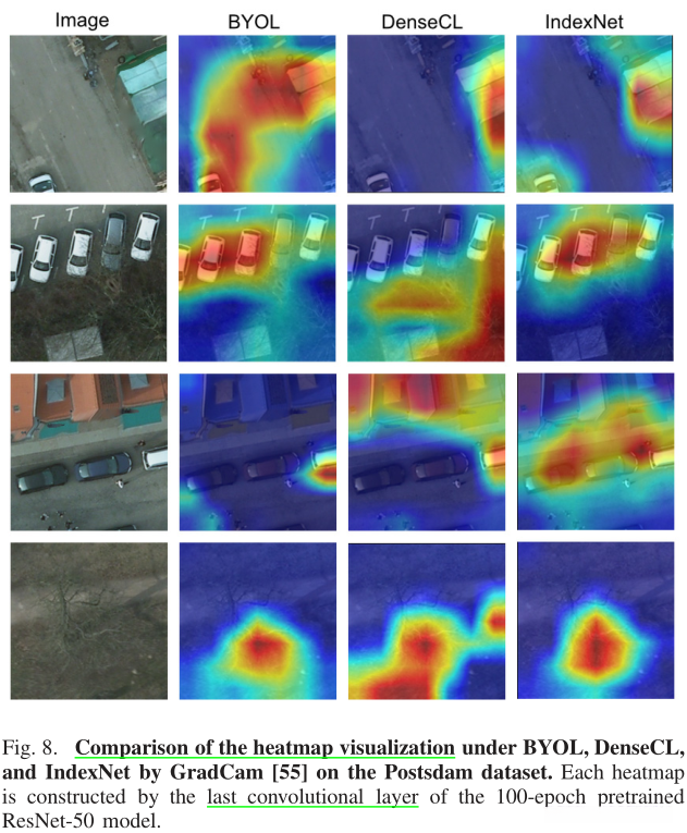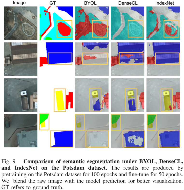 图 9 中可视化了不同模型在 Potsdam 语义分割任务上的一些结果。我们可以发现 BYOL 更容易误判像素的类别,因为它只关注图像级表示 。例如,在第二行和第四行中,BYOL 错误地对大量建筑物进行了分类。尽管 DenseCL 致力于提取像素级表示,但图 9 显示像素类别分配仍然存在一些错误 ,特别是当图像中的两个不同类别高度相似时(图 9 中的第一行和第二行) )。这与DenseCL依赖于仅根据特征相似性 选择属于同一对象的像素 ,而没有考虑空间位置的事实 有很大关系,这很容易导致不匹配。使用本文的 IndexNet,在分割任务中的性能变得更好,证明了 IndexNet 在处理 RSI 中的多目标问题方面的有效性。