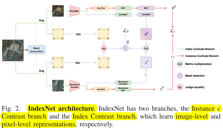 IndexNet 由 Index Contrast 分支和 Instance Contrast 分支组成 ,它们分别通过最小化损失函数 LI 和 LP 来学习像素级和图像级表示,如图 2 所示。在本节中,我们首先简要介绍学习BYOL [18] 的框架,我们研究所基于的 SOTA SSL 方法。然后,我们描述了在将 BYOL 应用于 RSI 的语义分割时所做的创新。
