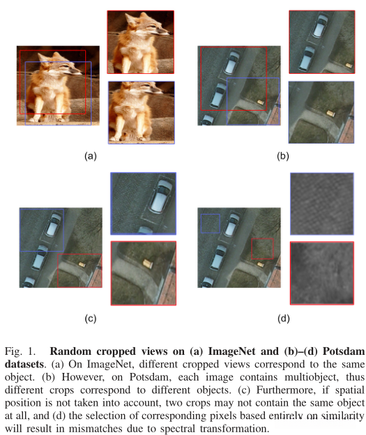 然而,由于 高空成像,RSI 通常代表 较宽的空间范围,这导致在一张图像中包含不同目标的可能性 。结果,不同的随机裁剪 可能对应不同的对象,如图1(b)和(c)所示。此外,当前的 SSL 方法主要是为 只需要图像级表示 的图像分类任务 而设计的。然而,语义分割 需要图像级 和 像素级的表示 才能产生有希望的结果。尽管越来越多的研究 [20]-[23] 研究了用于 密集预测任务的 SSL 预训练,但这些方法并未考虑 RSI 的独特特征 。例如,DenseCL [20] 和 Self-EMD [23] 通过基于 特征相似性 匹配像素 来学习像素级表示,但由于 RSI 中 目标的复杂多变的光谱响应 和在预训练期间图像的 人工增强[见图 1(d)],这些方法容易导致 对应像素不匹配。 DetCon [21] 需要对图像进行额外的 SSL 预训练分割,这既耗时又不适合 RSI 的实际应用。