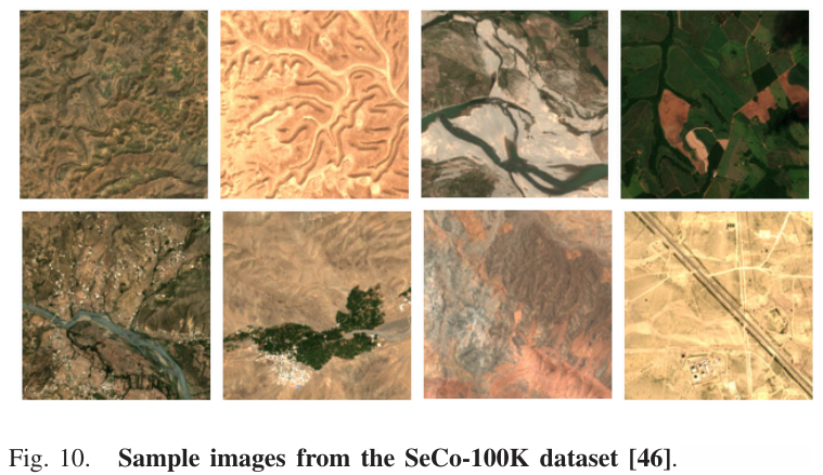最近,研究人员 还尝试将 SSL 应用于 RSI 分析。例如,文森齐等人 [41] 提出了一种类似于图像着色的方法来学习有意义的表示。 Stojnic 和 Risojevic [42] 评估了对比学习在 RSI 分类中的适用性,并表明在 RSI 上训练的自监督模型比在 ImageNet 上训练的监督模型给出了更好的结果。陶等人 [43] 分析了自监督信号的选择、源数据集和目标数据集之间的域差异 以及 SSL 中的预训练数据量 对 RSI 场景分类任务的影响。与 MoCo [16] 一样,SauMoCo [44] 也使用具有 对比损失公式 和 基于动量更新的优化 的增强标准 来利用土地覆盖概念中的 语义相似性 和 固有多样性。考虑到 遥感数据可以 随着时间的推移 提供对同一位置的重复观察 ,[45] 随着时间的推移 利用空间对齐的图像 来对比时间正对,并引入了 预测图像来自世界何处的 前置任务。 SeCo [46] 也使用来自不同时间阶段的同一位置的图像作为正对,但不同之处在于 SeCo 使用 多个嵌入子空间的思想 来学习编码 不同方差 和 不变性的通用表示。 MATTER [47] 提出了一种纹理细化网络来放大低级特征,并采用残差聚类学习来学习 RSI 的基于材料和纹理的表示。