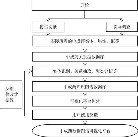 中成药是中药的主要流通形式。与中成药相关的数据多为半结构化或非结构化形式,具有数据容量大(Volume)、增速快(Velocity)、来源广(Variety)以及真实性较低(Veracity)的4V特征[3]。传统的关系型数据库在关联效率方面表现不佳,且难以进行扩展,已无法满足中医药数据高度关联的需求。知识图谱技术能够有效捕捉和呈现领域概念之间的复杂关系,并将分散的知识系统性地连接起来。知识图谱技术在中医药领域能够有效解决知识岛问题,有助于整合知识资源,提升知识服务能力。基于此,本文旨在构建基于知识图谱技术的中成药可视化与知识问答平台,以实现对复杂、多样的中成药数据进行高效管理和存储。